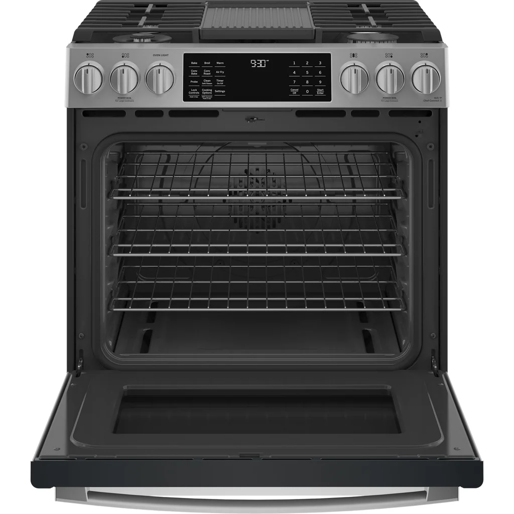 GE Profile 30″ Gas Range PGS930YPFS: 5.6 cu ft oven, 5 burners, Convection, Wi-Fi SmartHQ, self-cleaning, durable grates.
