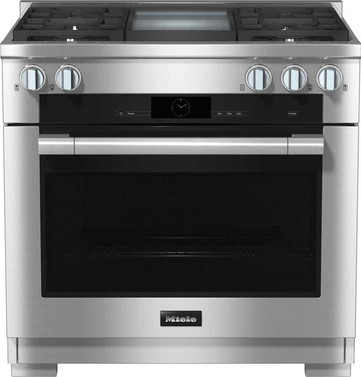 Miele 36″ Dual-Fuel Range HR1936DF: 5.8 cu ft oven, 6 burners, M Touch controls, Wi-Fi, TwinPower Convection, self-cleaning.